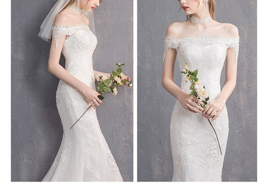 Short-Sleeve Off Shoulder Lace Trained Mermaid Wedding Gown