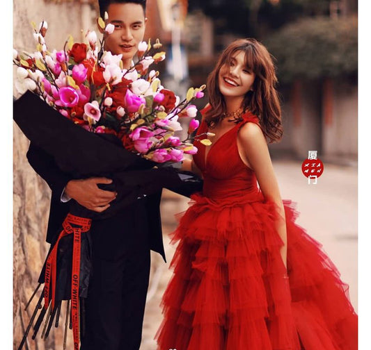 Sleeveless V-Neck Plain Tiered A-Line Evening Gown