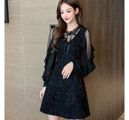 Puff-Sleeve Ruffled Collar Bow Sequined A-Line Cocktail Dress