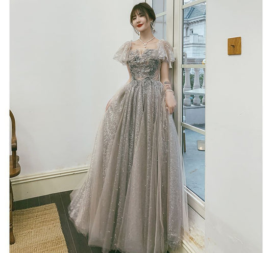 Puff-Sleeve Square Neck Sequin A-Line Evening Gown