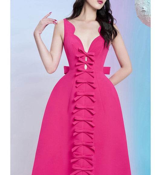 Sleeveless V-Neck Plain Bow Midi A-Line Cocktail Dress