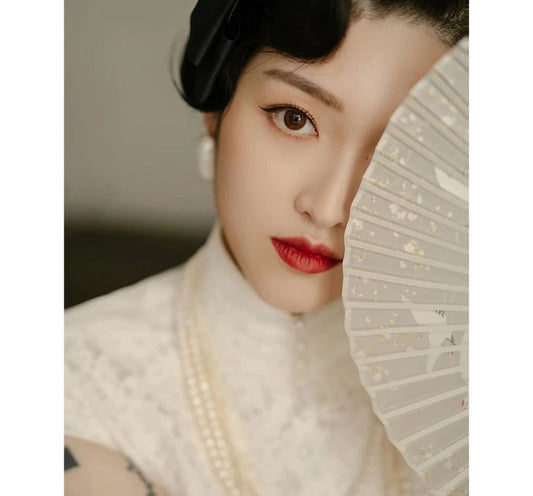 Short-Sleeve Lace Faux Pearl Midi Qipao