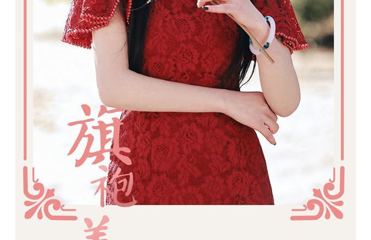 Short-Sleeve Floral Lace Mini Qipao