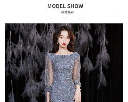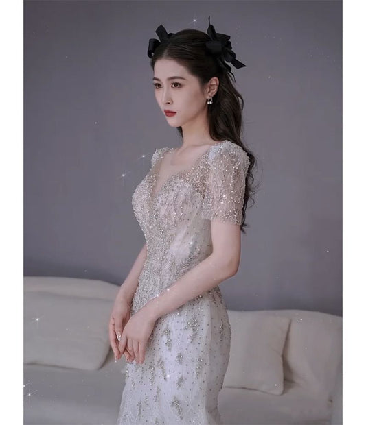 Puff-Sleeve Sequined Rhinestone Mermaid Evening Gown