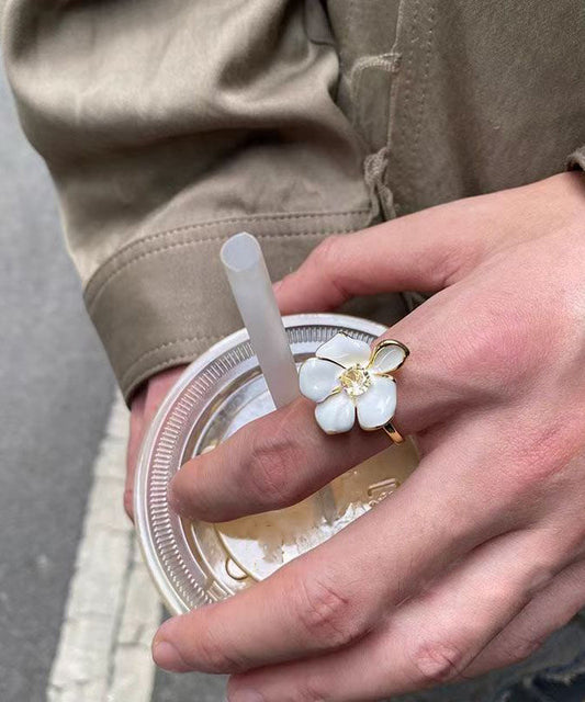 Zircon Elegant White Acrylic Floral Overgild Open Rings Copper