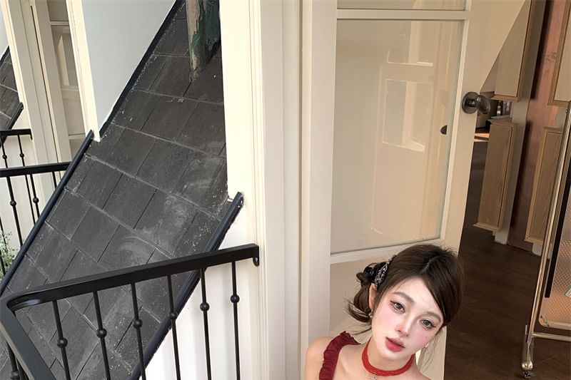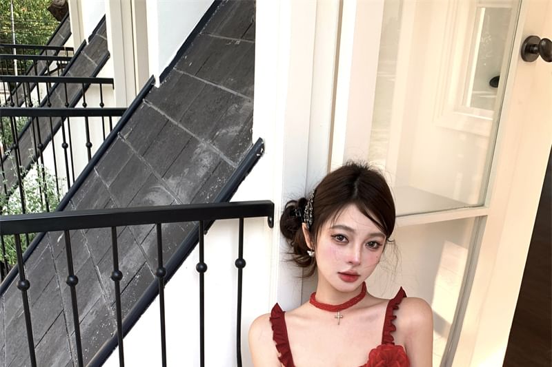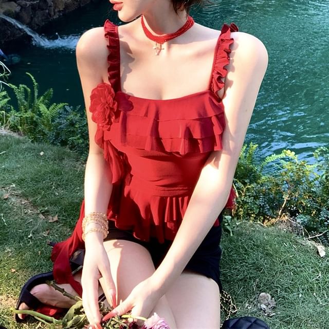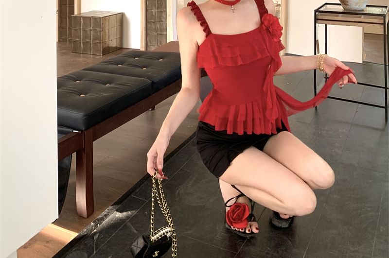 Asymmetrical Floral Ruffled Cami Top / High Waist Mini Pencil Skirt