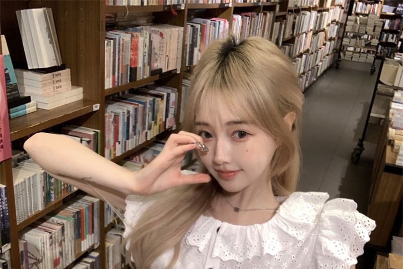 Cap-Sleeve Flower Embroidered Lace Trim Blouse / High Waist Plain Mini A-Line Skirt