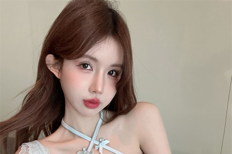 Cap-Sleeve Halter Neck Plain Lace Panel Bow Accent Slim Fit Crop Top