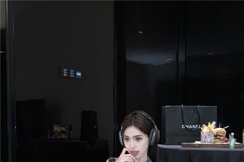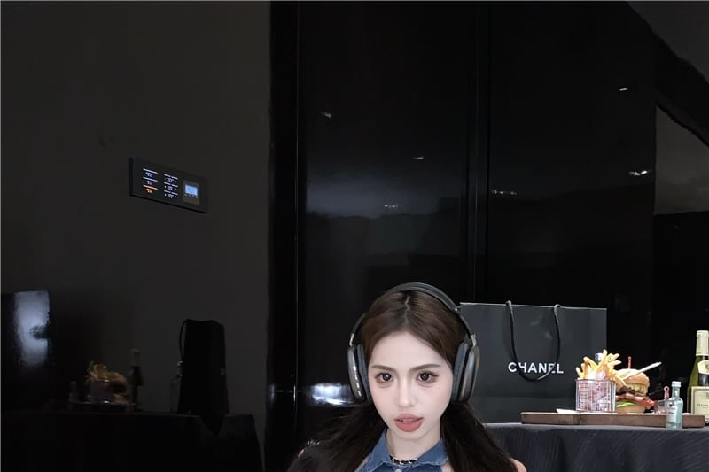 Collared Washed Crop Button Denim Vest / High Waist Mini Pencil Skirt