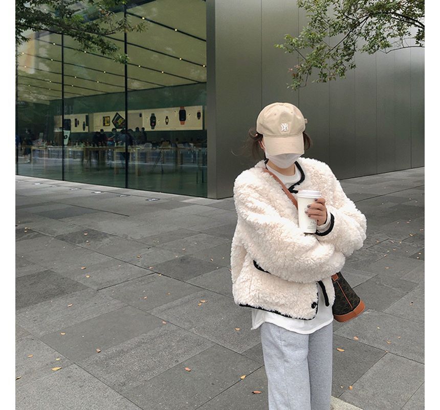 Crew Neck Contrast Trim Fluffy Button Jacket