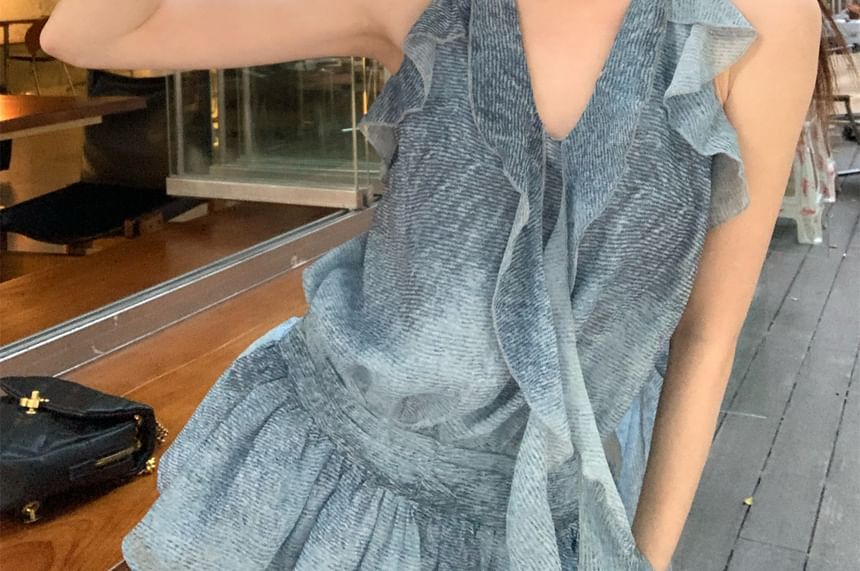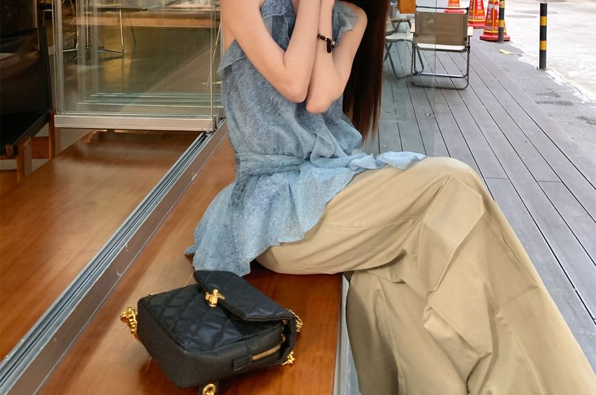 Halter Patterned Print Ruffle Top / High Waist Plain Wide Leg Cargo Pants