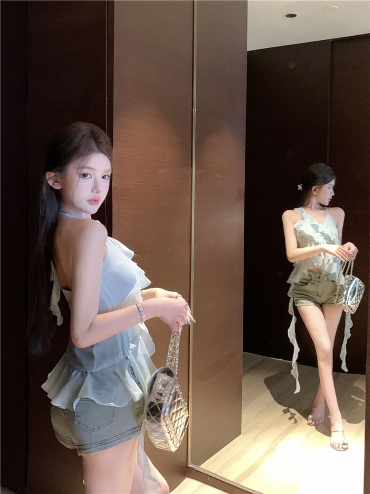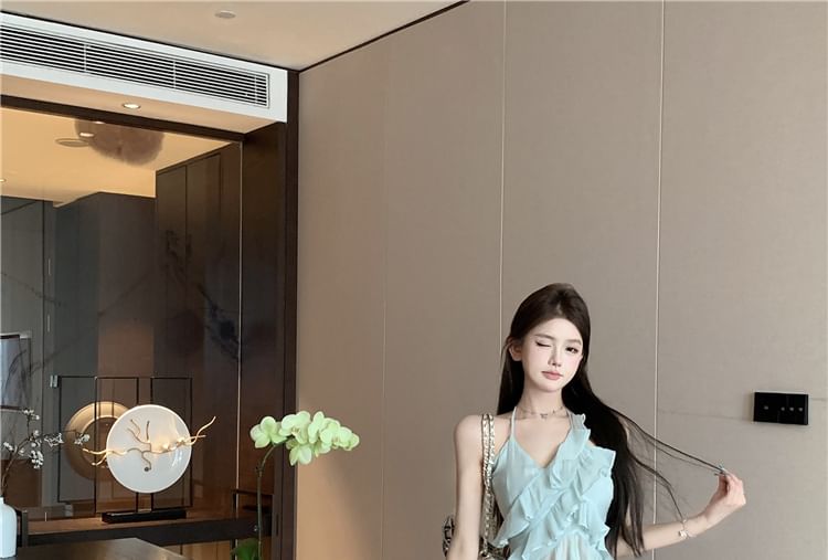 Halter-Neck Asymmetrical Tie-Dyed Ruffled Top