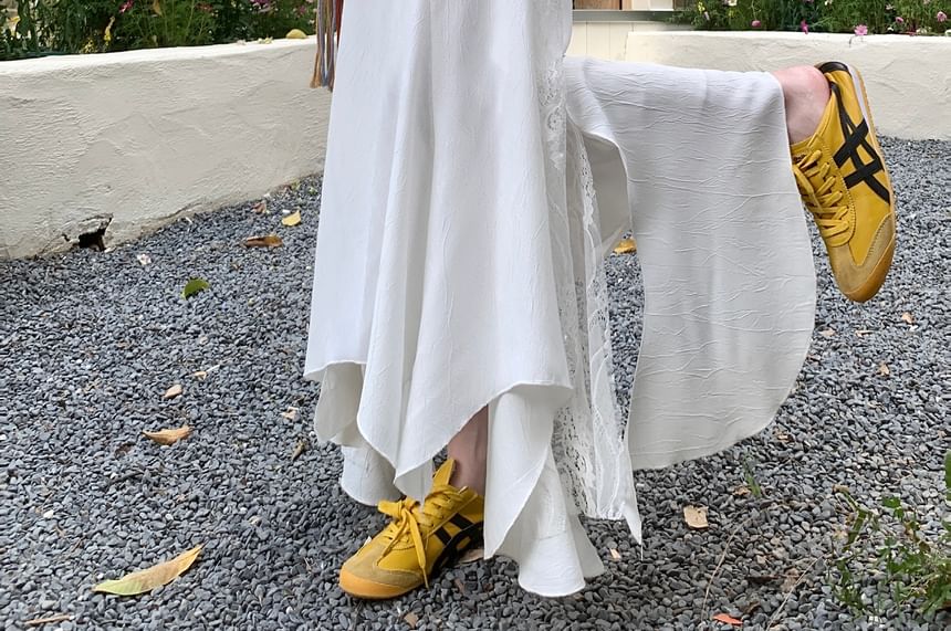 High Rise Asymmetrical Lace Panel Midi Mermaid Skirt