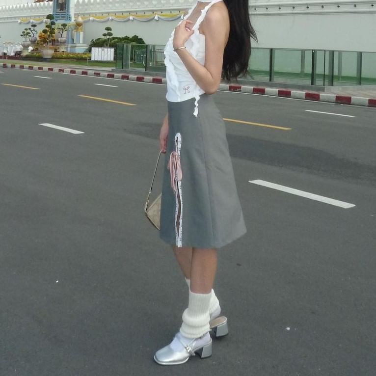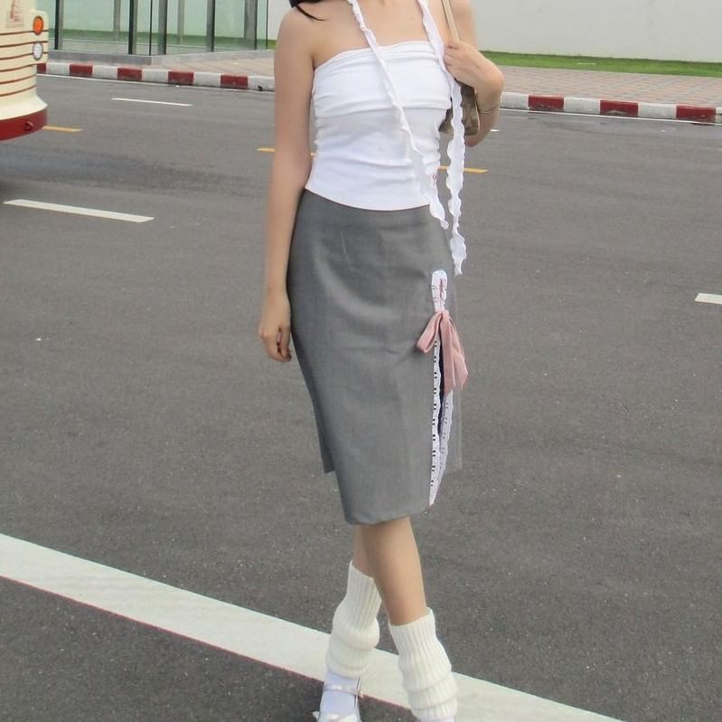 High Rise Plain Lace Trim Ribbon Midi Pencil Skirt
