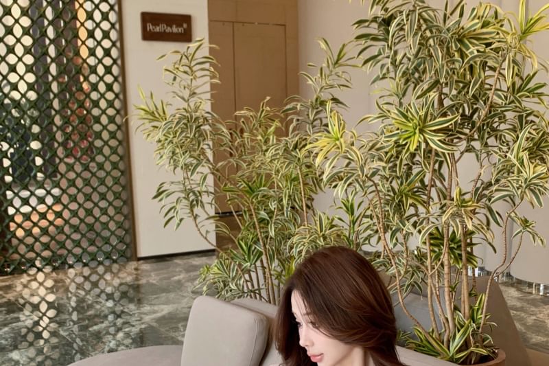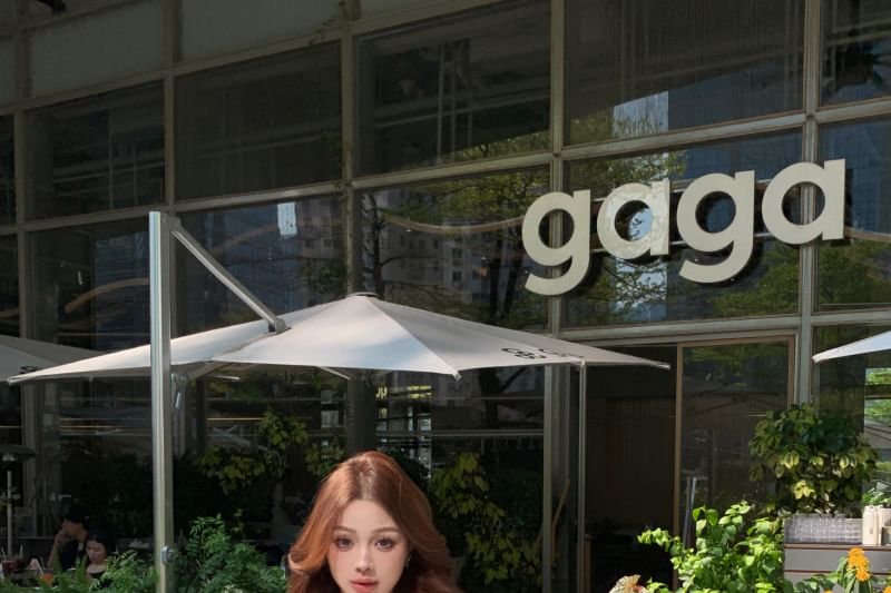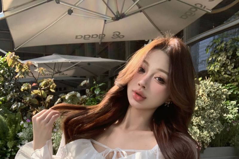 Long Sleeve V-Neck Plain Ruffle Tie Front Lace Trim Blouse / Mini Pencil Skirt