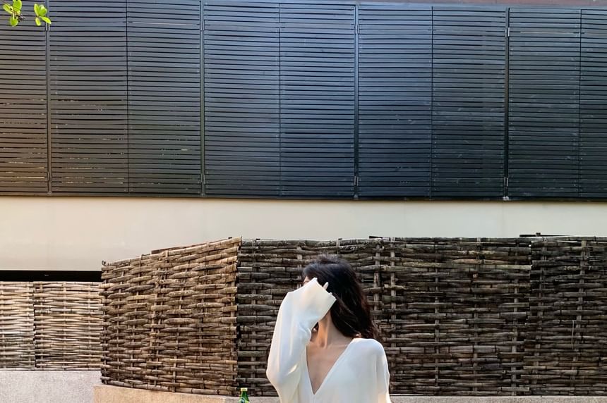 Long-Sleeve V-Neck Plain Blouse / Mid Waist Plain Maxi A-Line Skirt