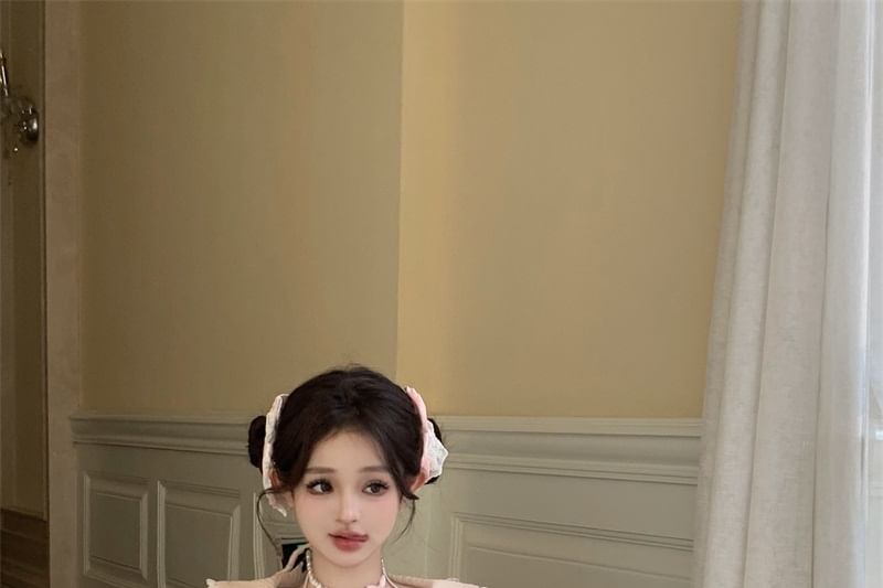 Mock Two-Piece Long-Sleeve Halter Neck Bow Accent Lace Trim Crop Knit Top / High Rise Plain Tiered Mini A-Line Skirt / Half Apron / Set