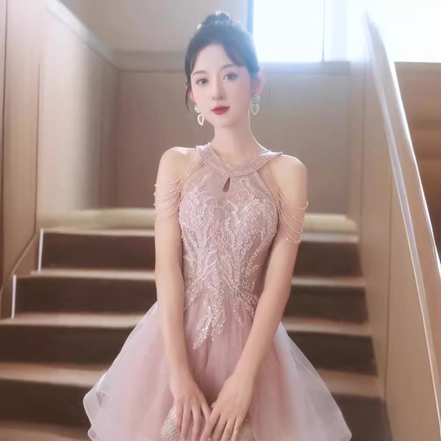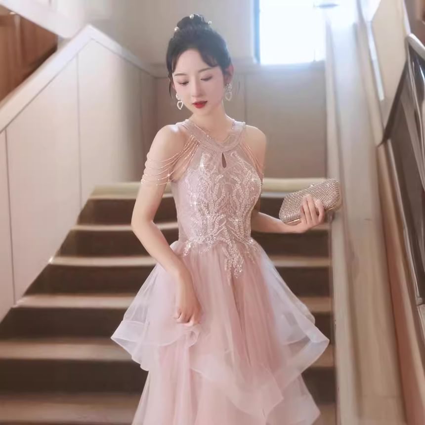 Cold-Shoulder Plaid Sequin Ruffle A-Line Evening Gown
