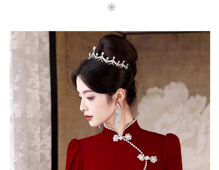 Long-Sleeve Mandarin Collar Faux Pearl Frog Closure A-Line Evening Gown
