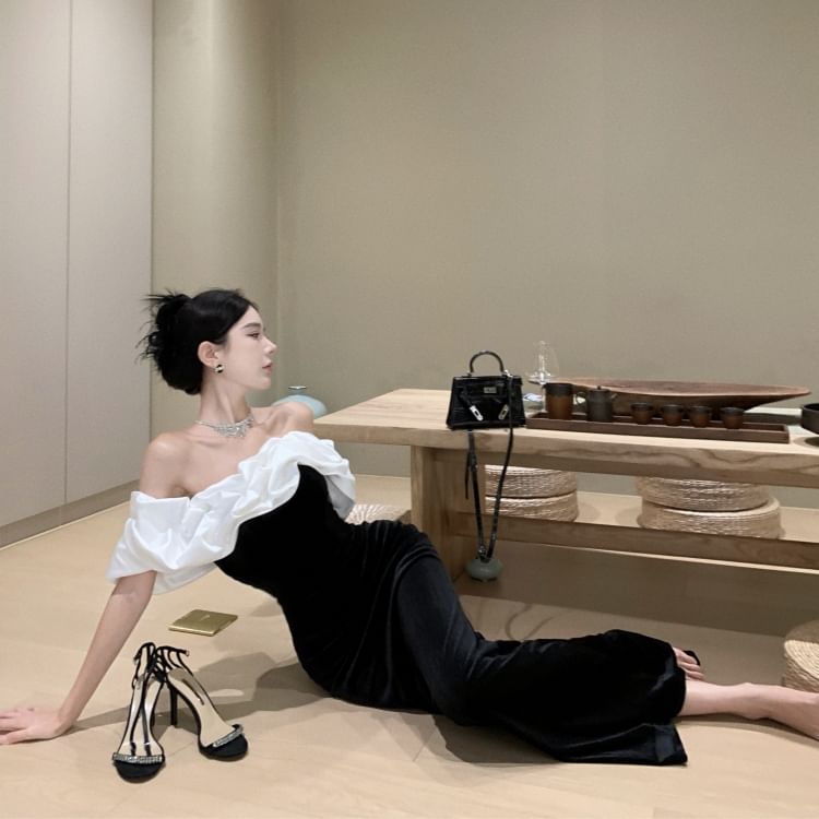 Off-Shoulder Two Tone Frill Trim Velvet Mermaid Evening Gown