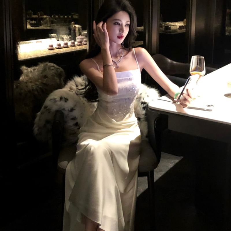 Spaghetti Strap Plain Sequin Satin Sheath Evening Gown