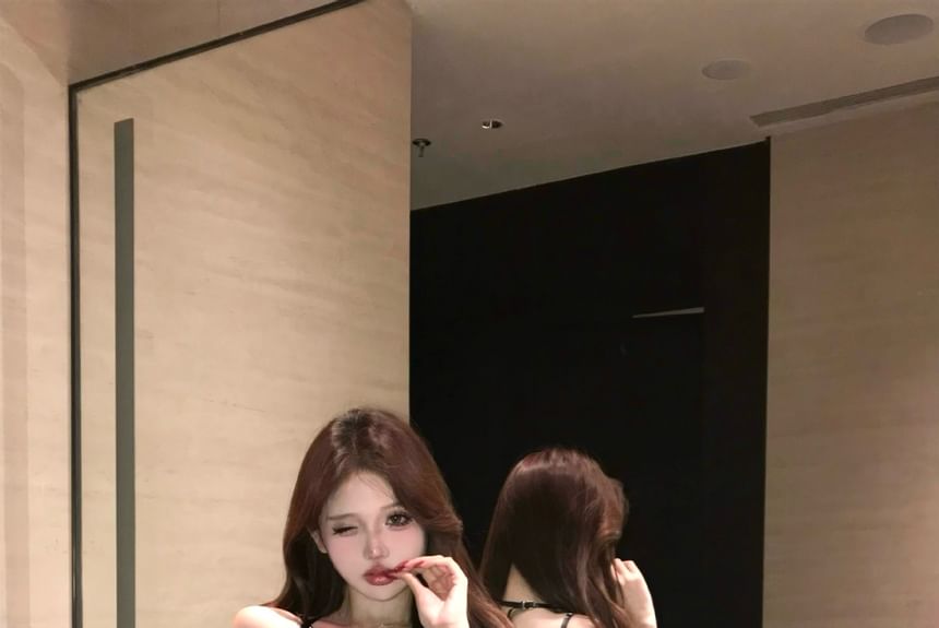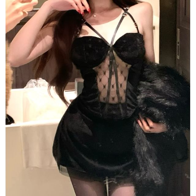 Patterned Mesh Panel Strappy Camisole Top / High Waist Plain Mini Pencil Skirt / Faux Fur Jacket
