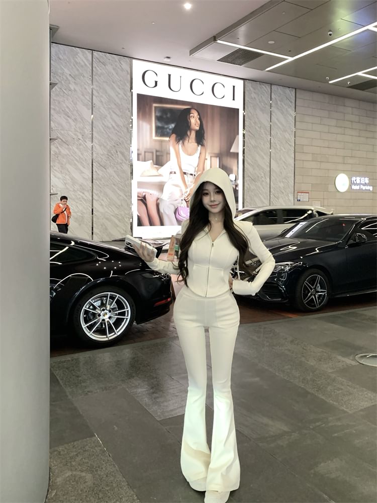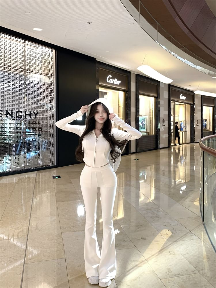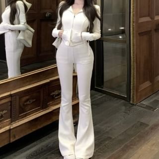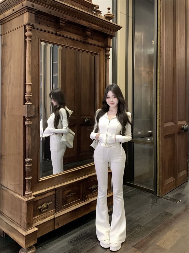 Plain Crop Zip Hoodie / High Waist Plain Flared Sweatpants