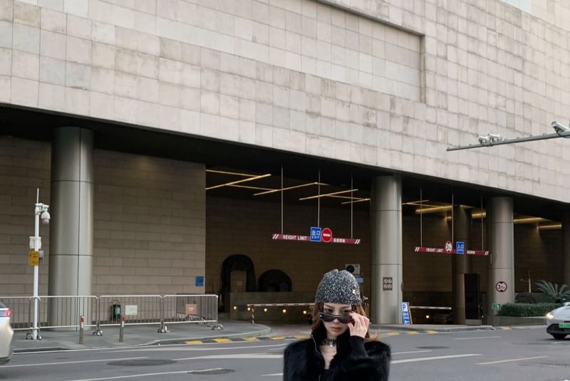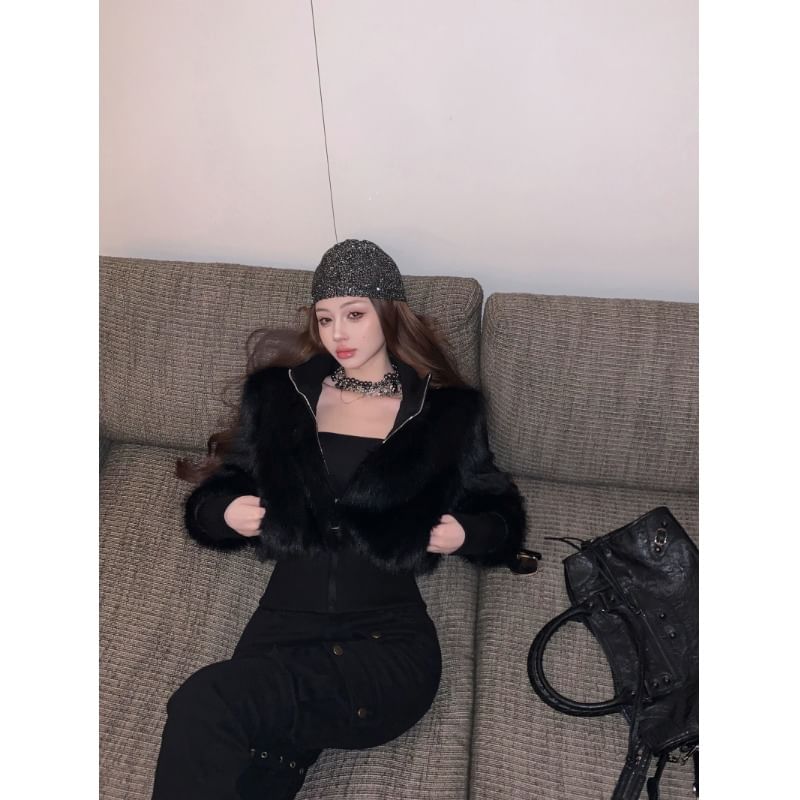 Plain Faux Fur Zip Jacket / High Rise Buckled Flared Jeans