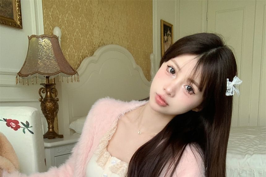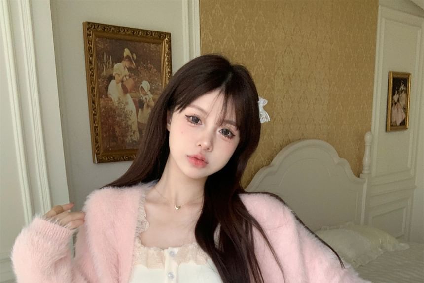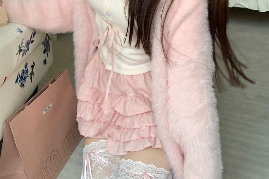 Plain Fluffy Open Front Cardigan / Lace Trim Cami Top / High Waist Ruffle Mini A-Line Skirt