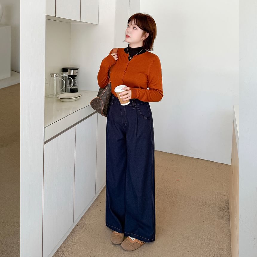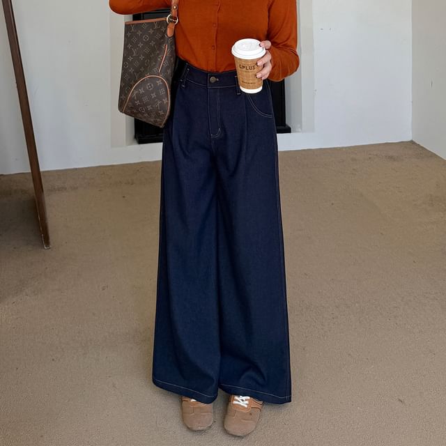 Plus Size High Rise Contrast Stitched Wide Leg Jeans