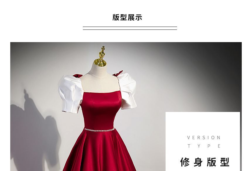 Puff-Sleeve Paneled Lace-Up Back A-Line Evening Gown