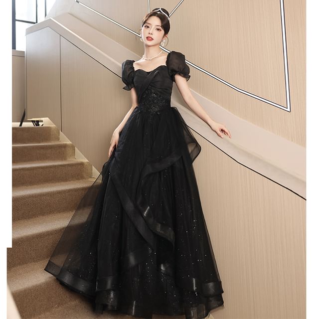 Puff Sleeve Square Neck Plain Sequin Ruffle Mesh A-Line Evening Gown