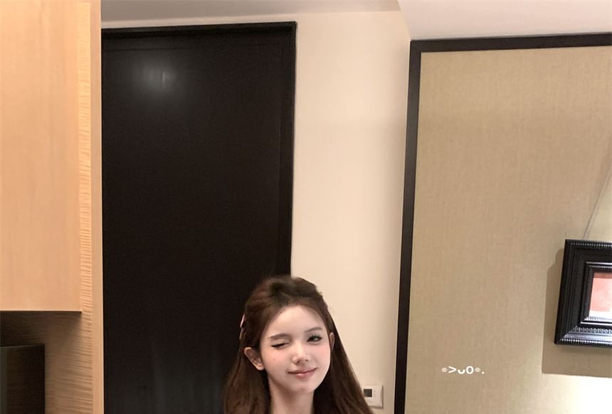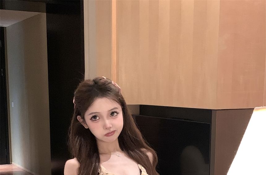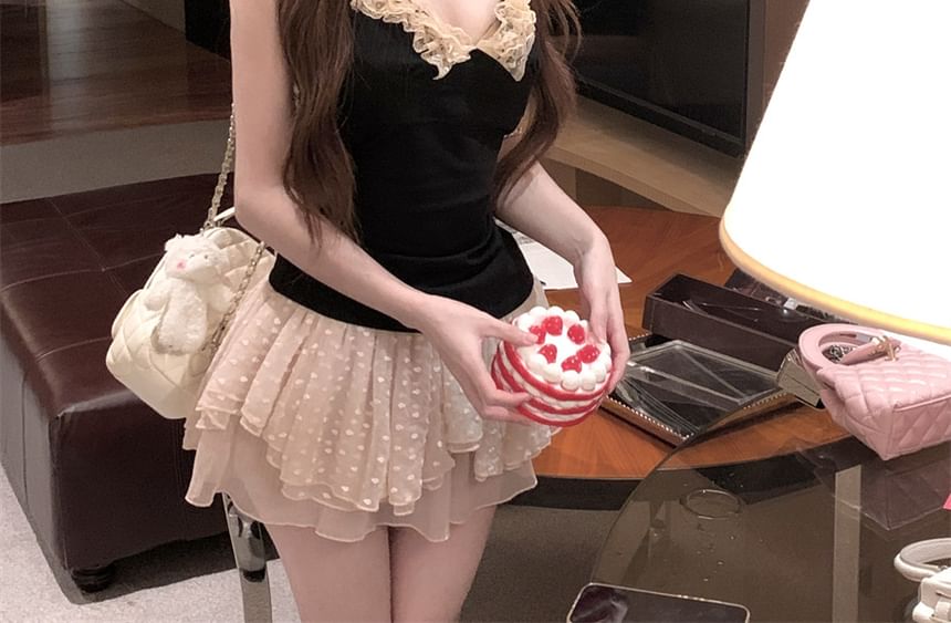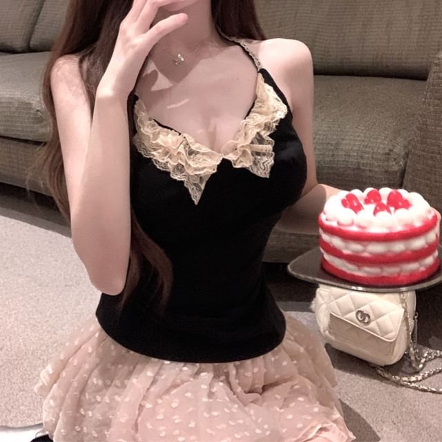 Scoop Neck Plain Lace Trim Halter Top / Mid Rise Dotted Asymmetrical Mini A-Line Skirt