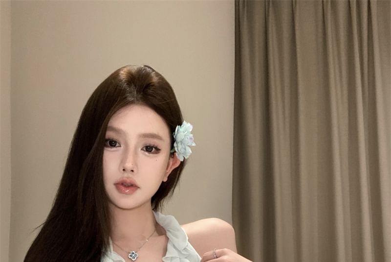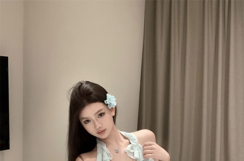 Scoop Neck Plain Ruffle Asymmetrical Halter Top / High Rise Mini A-Line Skirt