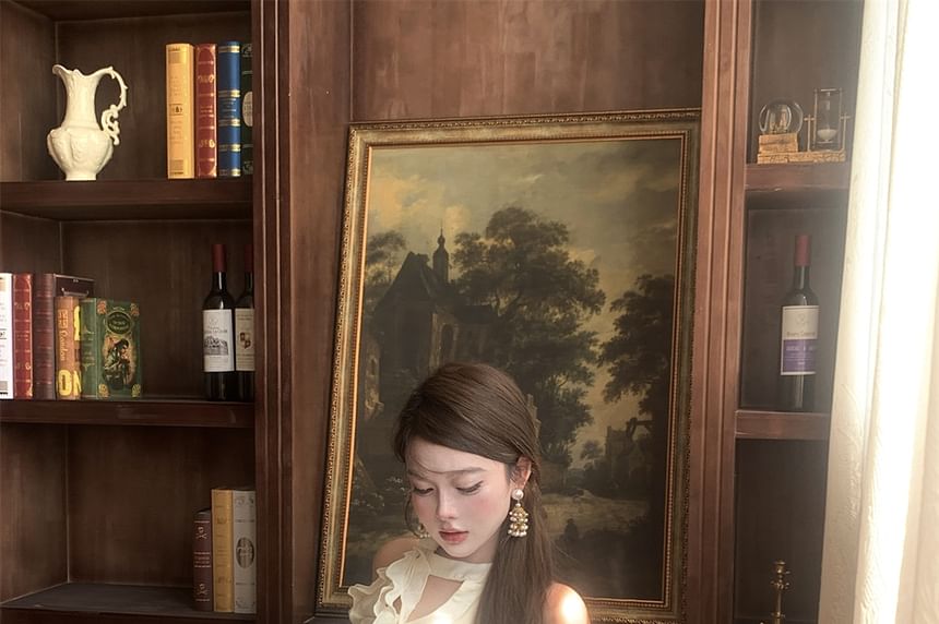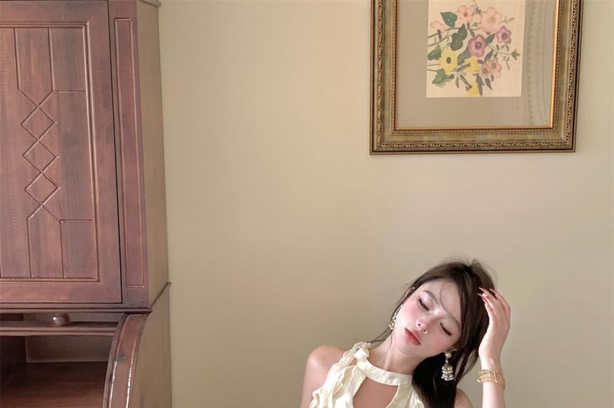 Set: Halter-Neck Plain Ruffled Mini A-Line Balloon Dress + Shorts
