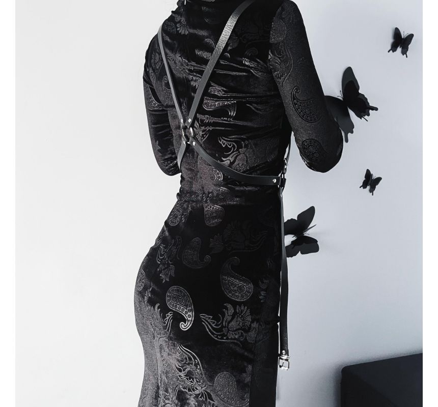 Set: Long-Sleeve Jacquard Velvet Midi Slit Qipao + Buckled Body Harness