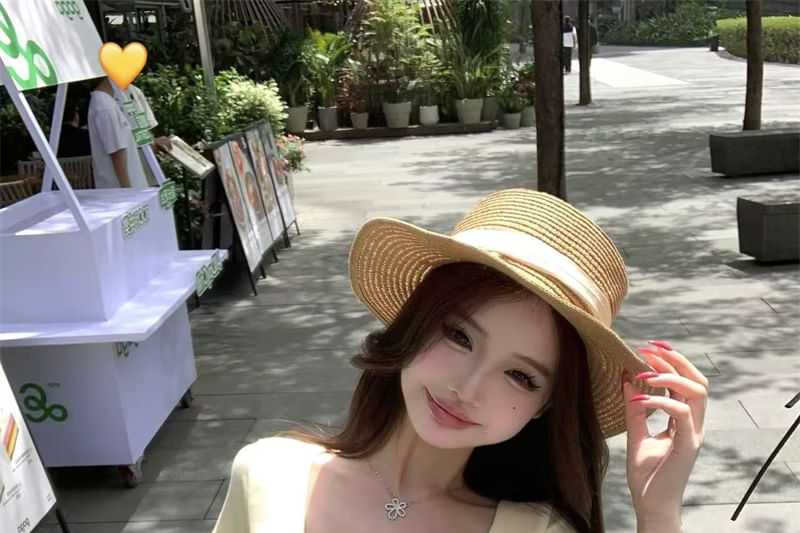 Short-Sleeve Scoop Neck Bow Slim Fit T-Shirt / Elastic Waist Floral Midi A-Line Skirt