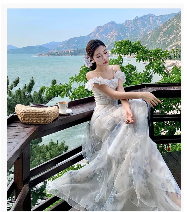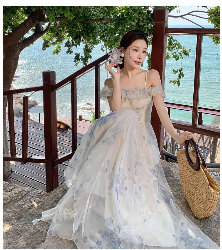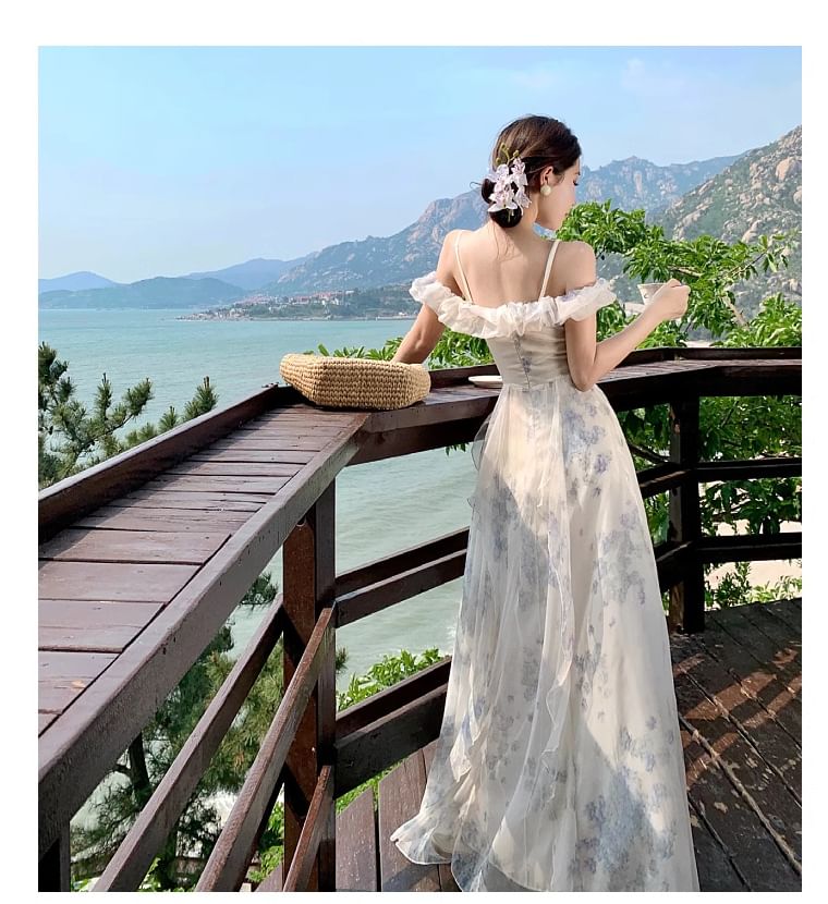 Square Neck Cold Shoulder Floral Print Ruffle Trim Ruched Maxi A-Line Dress
