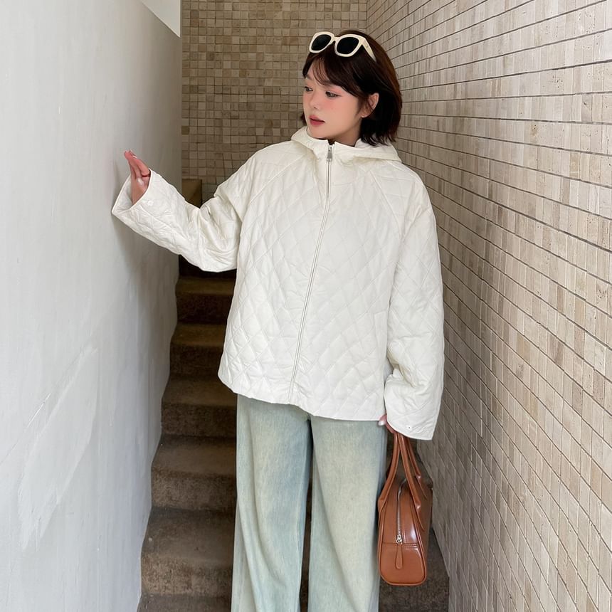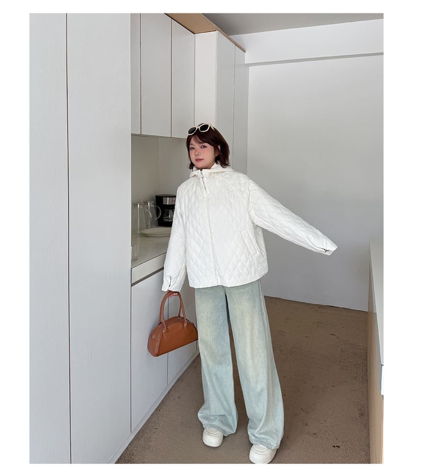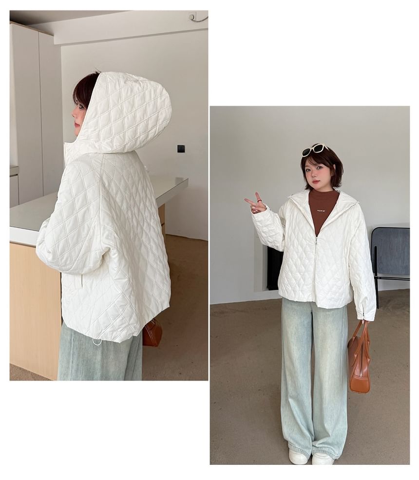 Stand Collar Plain Hooded Quilted Zip Jacket