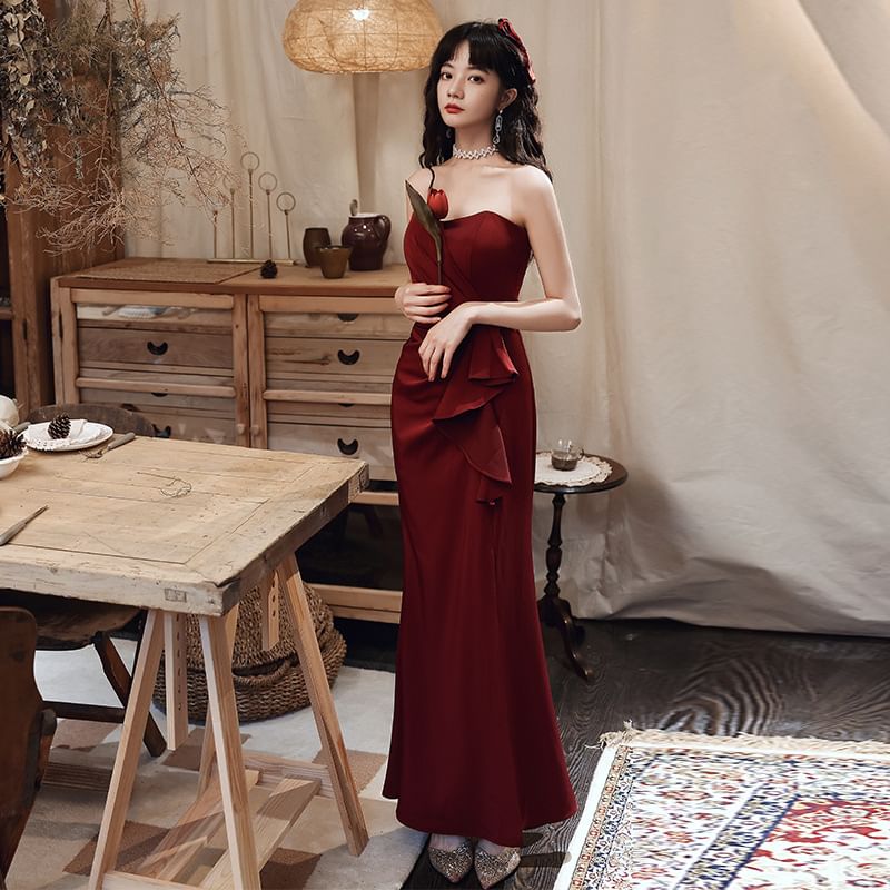 Strapless Asymmetrical Plain Ruffled Slit A-Line Evening Gown