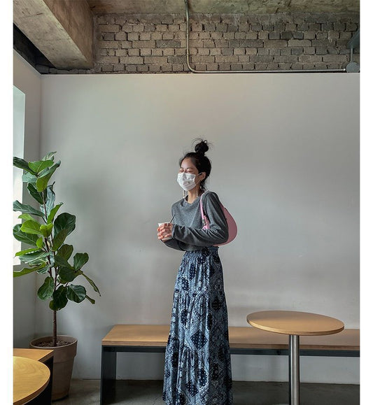 Elastic Waist Patterned Maxi A-Line Skirt