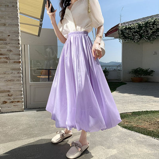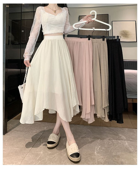 Elastic Waist Plain Asymmetrical Midi A-Line Skirt