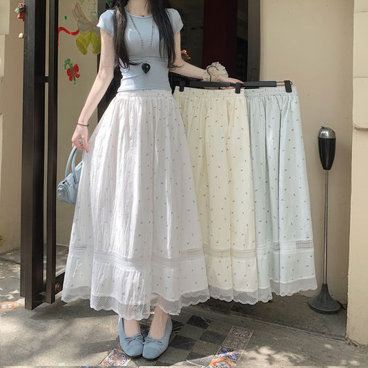 Elastic Waist Floral Lace Panel Midi A-Line Skirt