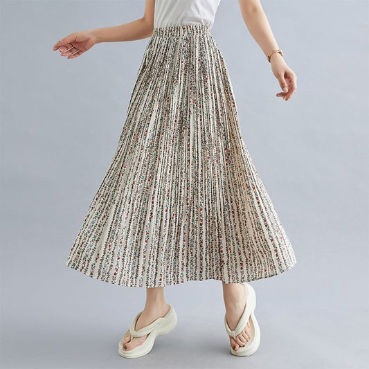 Elastic Waist Floral Print Accordion Pleated Maxi A-Line Skirt
