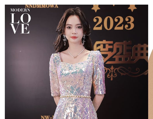 Elbow-Sleeve Sequin Mesh A-Line Evening Gown
