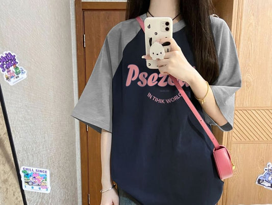 Elbow-Sleeve Round Neck Lettering Raglan Tee
