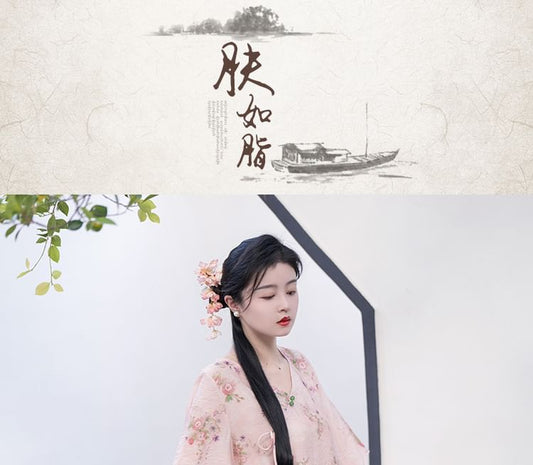 Elbow-Sleeve Floral Side-Slit Midi Hanfu Dress / High Waist Plain Wide Leg Pants / Set