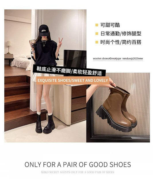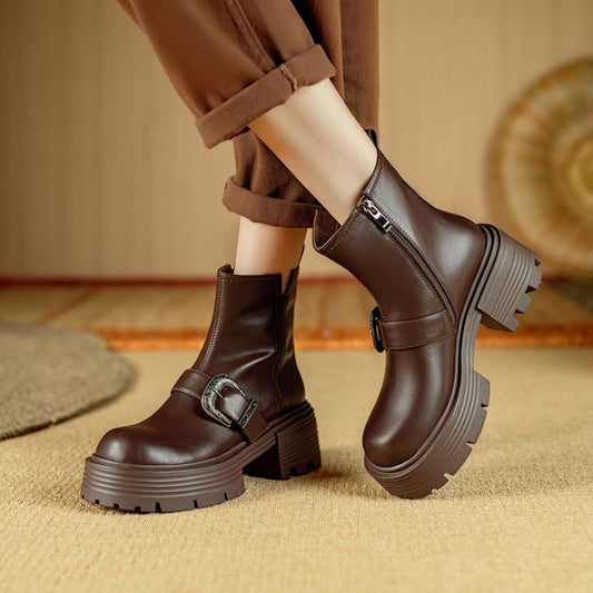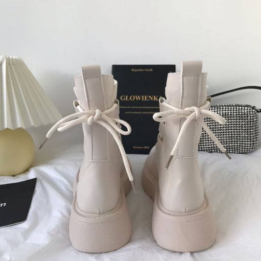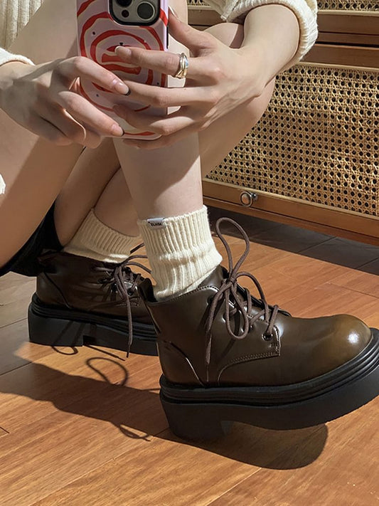 Platform Leather Boots Plain Genuine Short Lace-Up