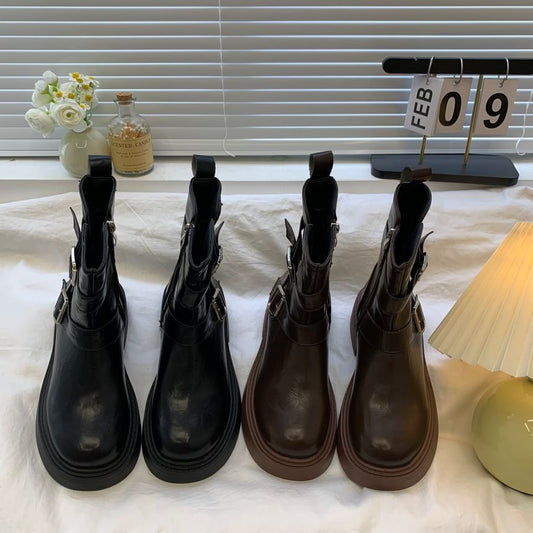 Platform Plain Buckled Faux Suede Mid-Calf Boots