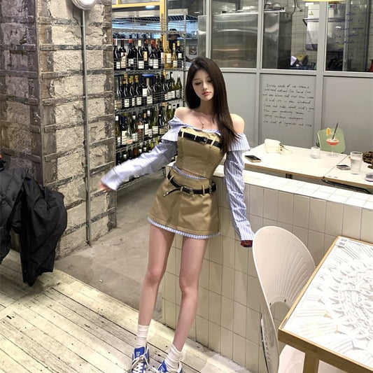 Plus Size Set: Mock Two-Piece Long-Sleeve Two-Tone Collared Sweatshirt + High Waist Midi A-Line Skirt